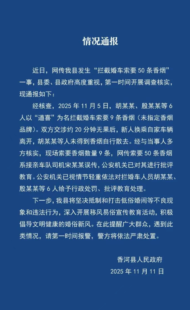 经核查,2025年11月5日,胡某某、殷某某等6人以“道喜”为名拦截婚车索要9条香烟(未指定香烟品牌)。双方交涉约20分钟无果后,新人换乘自家车辆离开,胡某某等人未得到香烟自行散去。经与当事人多方核实,现场索要香烟数量9条,网传索要50条香烟系接亲车队司机宋某某误传,公安机关已对其进行批评教育。公安机关已视情节轻重依法对拦婚车人员胡某某、殷某某等6人给予行政处罚、批评教育处理。